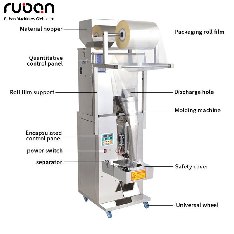 هذه الآلة العمودية لتعبئة الحبيبات هي جهاز متكامل أوتوماتيكي بالكامل، بهيكل من الفولاذ المقاوم للصدأ، ومجهز بوحدات متكاملة تشمل تغذية لفائف الأغشية، والقياس الدقيق، وتصنيع الأكياس وإغلاقها. وهي مزودة بعجلات دوارة في الأسفل لسهولة الحركة. تُناسب هذه الآلة تعبئة الأكياس الصغيرة لمختلف المواد، بما في ذلك الشاي، والأدوية الحبيبية، وملحقات الأجهزة، وحبيبات الطعام. ويمكن ضبط المعايير عبر لوحة التشغيل المرئية، مما يُتيح عملية مؤتمتة بالكامل من تعبئة المواد إلى إخراج المنتج النهائي.