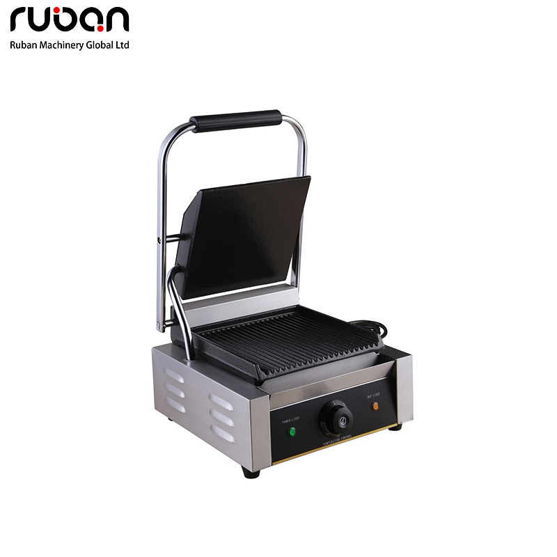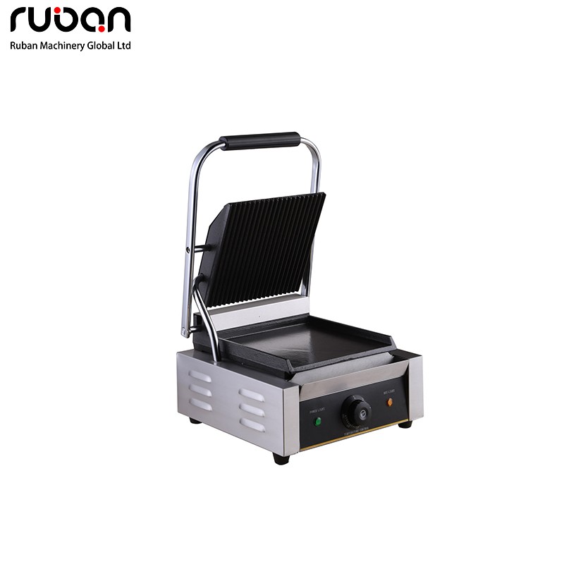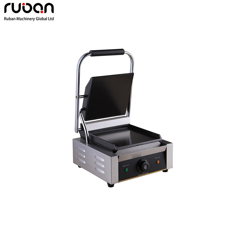 تتميز مكبس البانيني الكهربائي التجاري هذا بإطار متين من الفولاذ المقاوم للصدأ وألواح حديدية مصبوبة شديدة التحمل ذات أخاديد. وهو مزود بمقبض تحكم دقيق في درجة الحرارة ومؤشرات ضوئية، مما يضمن توزيعًا متساويًا للحرارة لتحمير البانيني والبرغر وشرائح اللحم والسندويشات بشكل مثالي. بفضل تصميمه المدمج الذي يوضع على سطح الطاولة وسهولة تنظيفه، يُعد هذا المكبس محطة طهي أساسية للمطاعم والمقاهي وعربات الطعام وشركات تقديم الطعام.