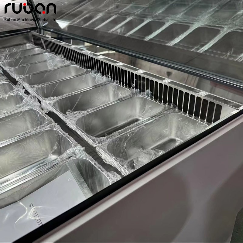 2. تأثير العرض: تتميز منطقة العرض ذات الزاوية القائمة المحاطة بزجاج مقسى شفاف بالكامل بنفاذية جيدة للضوء وعدم وجود بقع عمياء بصرية، مما يسمح بإظهار أنماط وألوان الآيس كريم بالداخل بوضوح ويعزز جاذبية المنتج؛ مادة الزجاج مقاومة للتآكل والصدمات وسهلة التنظيف.