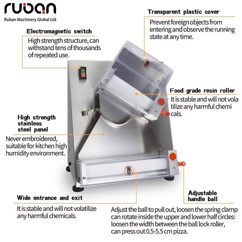 صُممت آلة فرد عجينة البيتزا التجارية هذه من الفولاذ المقاوم للصدأ الآمن غذائيًا، وهي مثالية للمطابخ التجارية. تتميز بمدخل مائل لفرد العجين تلقائيًا، وبكرات قابلة للتعديل لضبط سمك العجين وتشكيل قواعد البيتزا الدائرية، بالإضافة إلى ميزات أمان مثل الأغطية الشفافة، والحماية الكهربائية، وأنظمة الحماية من الحمل الزائد للمحرك. كما يتوفر خيار التحكم بالدواسة لمزيد من الراحة.