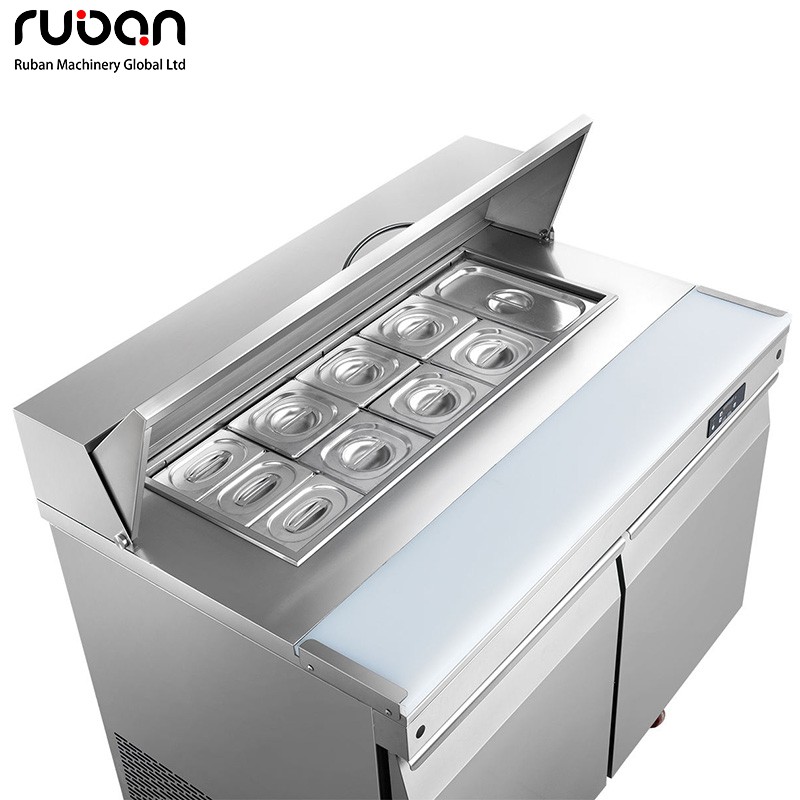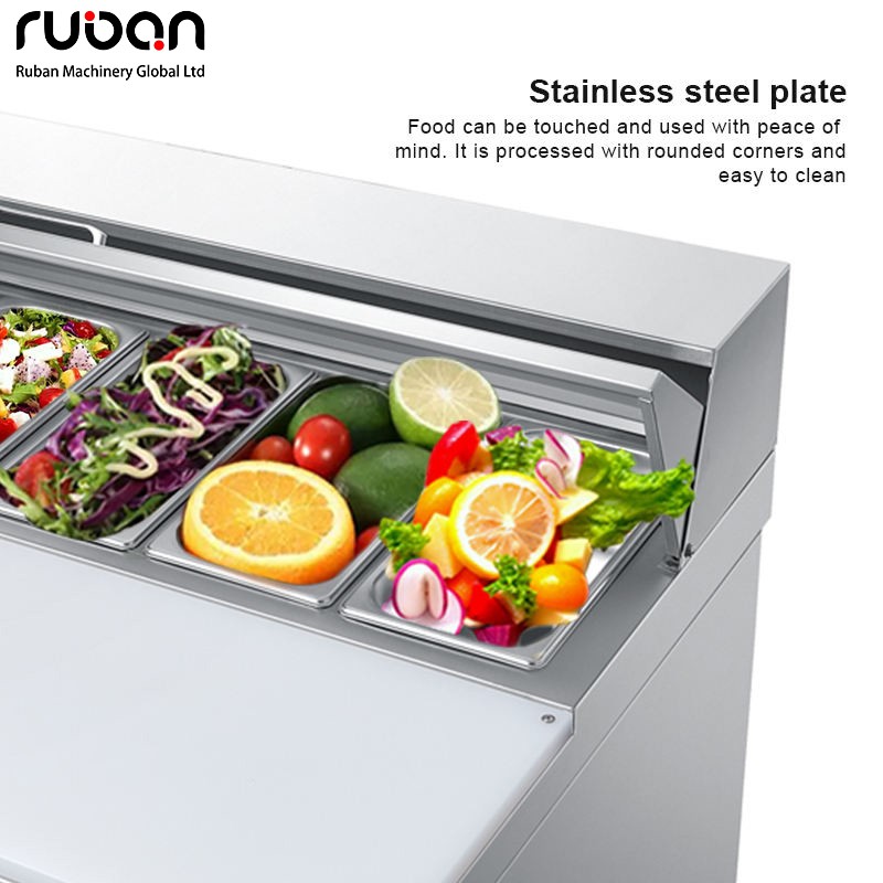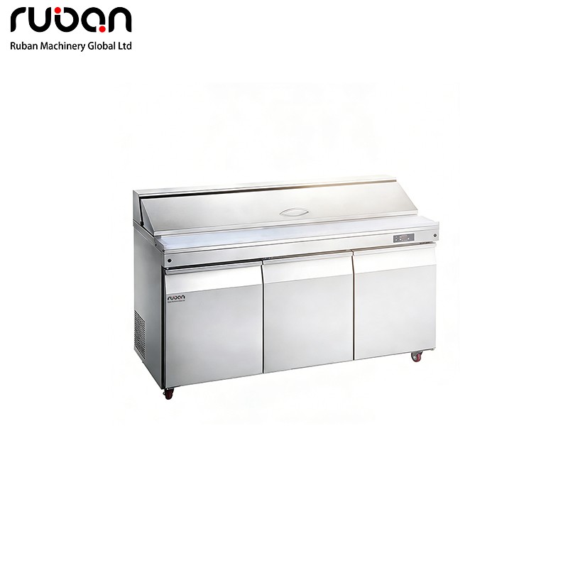 صُممت طاولة تحضير السلطة التجارية هذه خصيصًا لتحضير السلطة وحفظ مكوناتها في المطاعم والمقاهي. مصنوعة من الفولاذ المقاوم للصدأ الآمن غذائيًا، فهي متينة وقوية وسهلة التنظيف. تتميز الطاولة بتصميم مقسم إلى مناطق واضحة: حيث يمكن استخدام حجرة التبريد لحفظ الخضراوات والفواكه والصلصات، وبفضل نظام التحكم الدقيق في درجة الحرارة، تحافظ على نضارتها لفترة طويلة. تتميز منطقة العمل بسطح عمل مسطح وواسع، مناسب لجميع أنواع تحضير السلطة، ويلبي احتياجات تحضير الوجبات بكفاءة في المطابخ الخلفية. بفضل زواياها الدائرية الناعمة والخالية من النتوءات، تمنع الطاولة الاصطدامات والإصابات العرضية، مما يجعلها خيارًا مثاليًا لمطاعم الوجبات السريعة، ومتاجر الأطعمة الخفيفة، ومطاعم البوفيه.